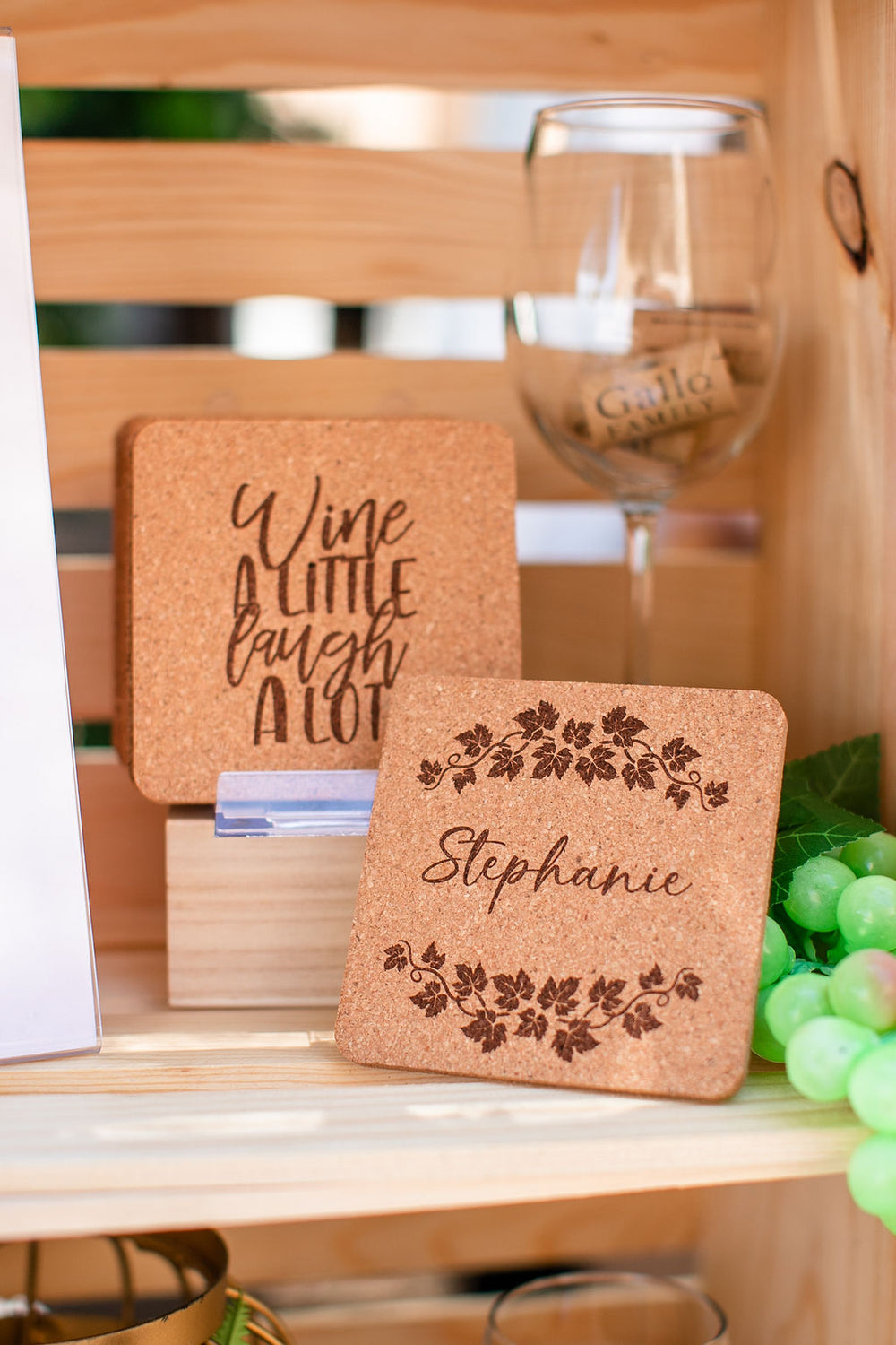 We'll work together to select keepsakes that feel elevated and meaningful for your guests. Coasters and wine stoppers are refined, go-to favorites—effortless to engrave and always well received. If you're planning something with a specific aesthetic or guest experience in mind, we’ll tailor options that feel thoughtfully aligned with your event’s tone and style.